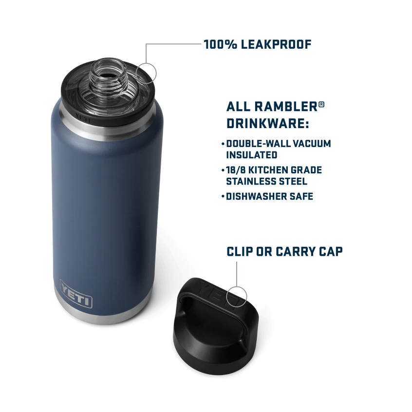 The Rambler® 36 oz. Bottle (1L) is designed for a life in the wild. Scorching days on the ranch and keeping you hydrated through rugged terrain are this bottle's calling, second only to keeping your drinks icy cold (or perfectly hot). For easy cleaning and use day after day, this reusable bottle is dishwasher safe. With a quick twist, the TripleHaul™ handle comes off, exposing our shatter-resistant, dishwasher safe spout that allows for controlled gulps on the go. When it's time for a wash or refill, remove the entire cap to expose the bottle's wide mouth. Find a colour that calls to you – these big bottles are available in stainless, DuraCoat™, and Seasonal finishes.