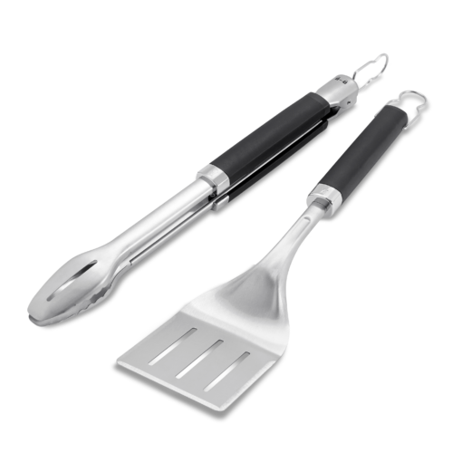 The Precision Grill Tongs & Spatula Set is designed for performance. Both feature a durable stainless-steel construction and soft-touch handle for comfort and control. The hands-free locking tongs are designed with a flat front edge that provides a secure grip as you lift and turn fragile foods. The spatula features a 3-sided beveled edge to easily slide under foods. Both tools are dishwasher-safe for easy cleaning.